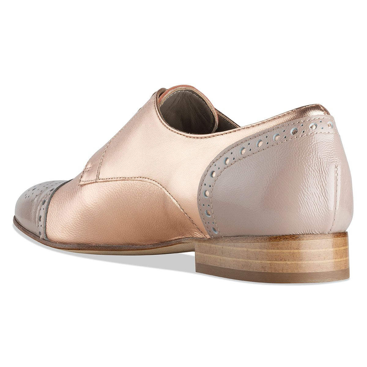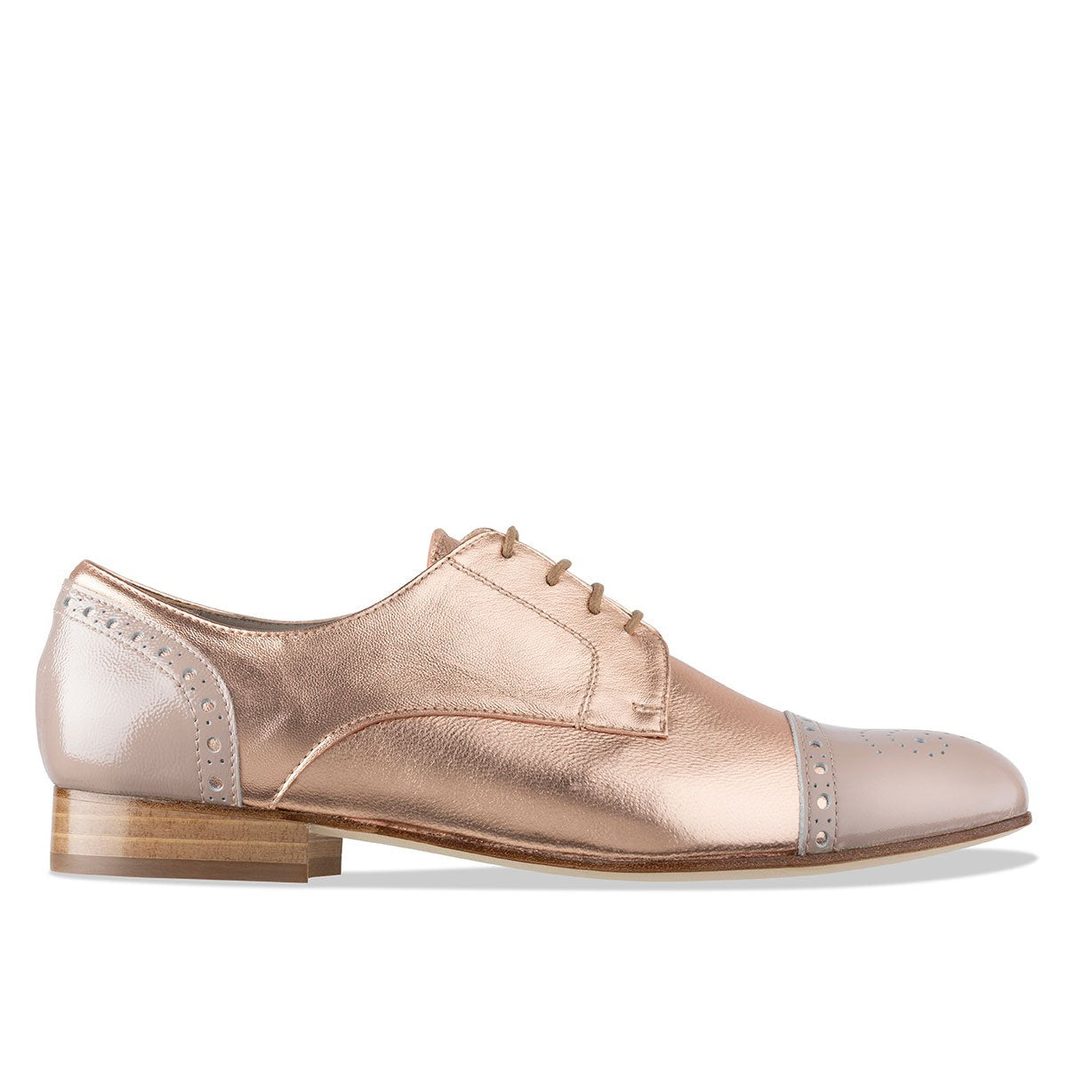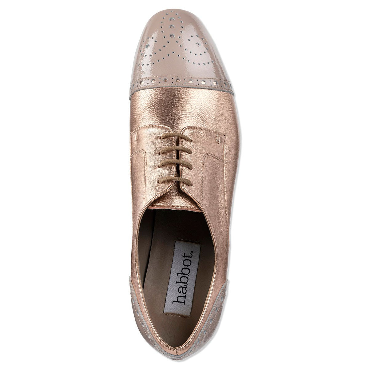 habbot ‘Nara’ women’s flats are our signature lace-up style. This timeless derby brogue combines a flattering, yet supremely comfortable shape with a confident aesthetic twist. Perfect for most foot shapes including those with higher arches, the Nara’s sleek, feminine silhouette, elegant almond toe and combination nude patent and rose gold leather colourway adds a touch of individuality and stylish flair to corporate wear or an evening out.